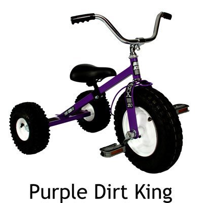 Your littlest adventurer will be safe during all of his or her travels with this sturdy tricycle along for the ride. Made of steel in a blue powder coat finish for long lasting style, the durable cycle is highlighted by oversized air filled tires with textures surfaces for all terrain traction. Made in USA. Assembly required. Seat to Center Axle: Closest = 10 in., Farthest: 18 in.. Made of 14 and 16 gauge steel . Knobby, Pneumatic, Over sized tires. Heavy duty steel rims. 5/8 in. steel ball bearings. Wide profile dished seat. Adjustable seat sitting above the back wheels and partially below the front wheel. Large comfort pedals w/ recessed amber reflectors. 34 in. L x 24 in. W x 28 in. H (38 lbs.) The traditional children's tricycle is one that is offered usually with simple design and made of either plastic or wood. The Dirt King is made of 14 and 16 gauge steel and was engineered to be past-on to future generations. The Dirt King is ideal for parents who are looking for their first outdoor children's tricycle. Like all other children's tricycles, the Dirt King has no braking method, aside from putting your feet down on the ground. The design is one that has the adjustable seat sitting above the back wheels and partially below the front wheel. The over-sized tires are designed to roll-over any terrain and makes riding on gravel, grass, and uneven sidewalks a breeze. The smooth ride comes from the Dirt Kings 5/8 inch ball bearings. The over-sized front wheel, similar to the popular "big wheel", is made to make it easier to maneuver for some children.Tricycle - Unassembled (Purple) Review